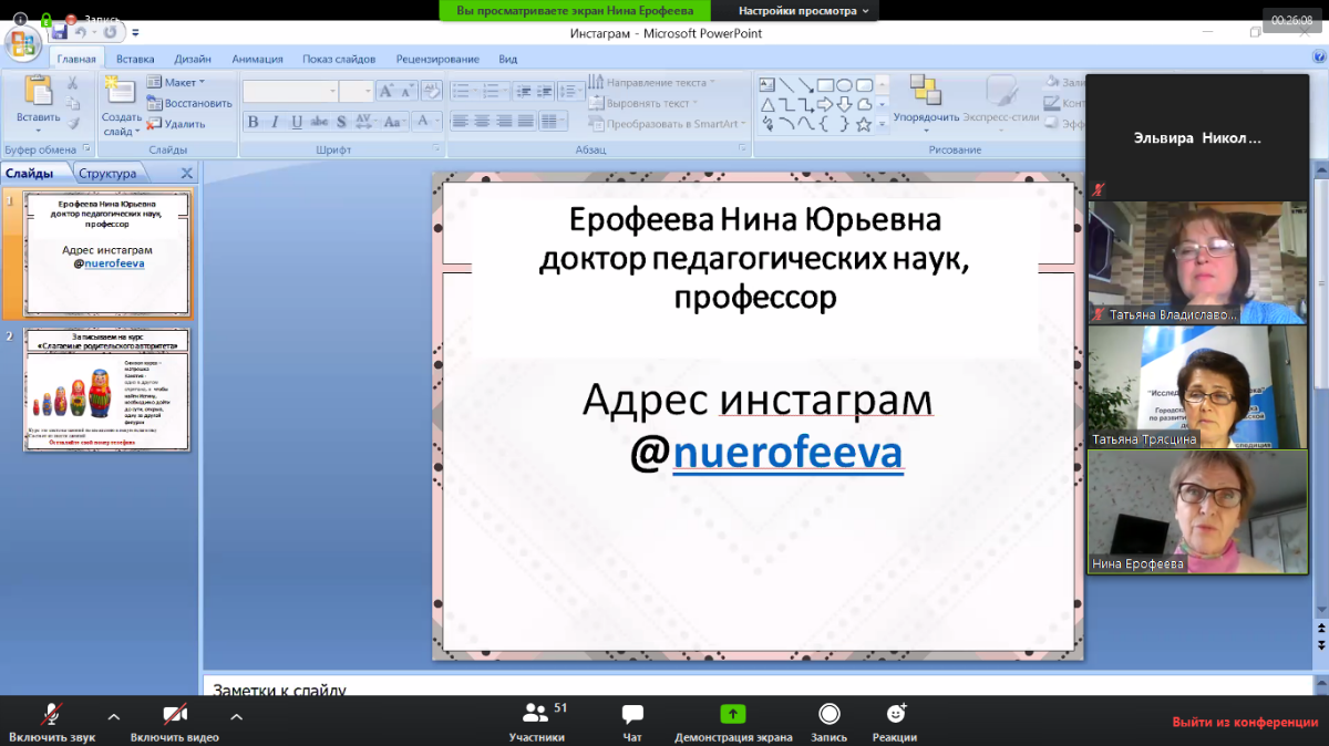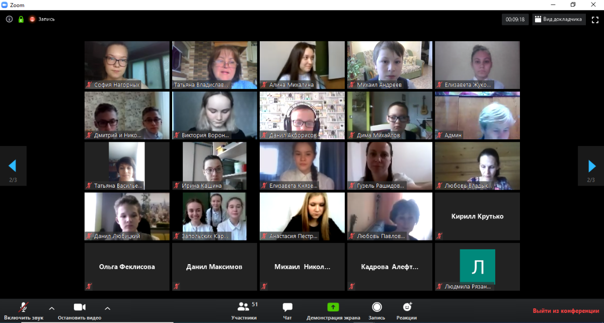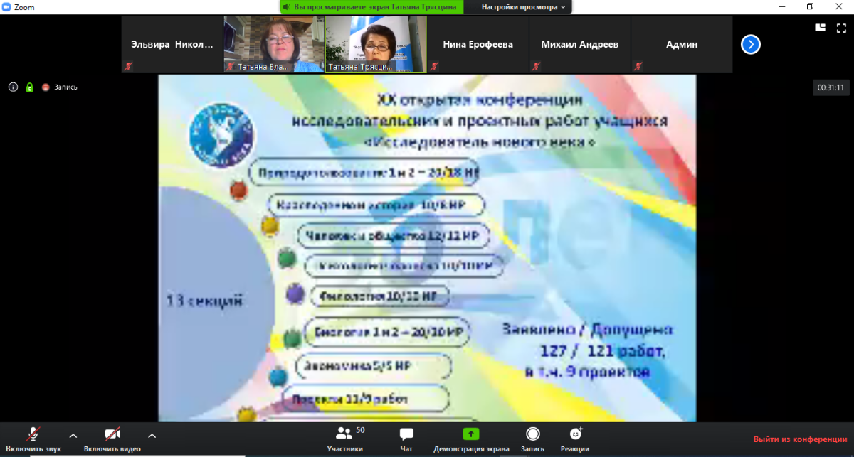 После общего сбора в зале видеоконференции участники расходились по трём сессионным залам–секциям. На секции руководители экспертов организовывали процесс защиты работ. У каждого участника секции была возможность участвовать в обсуждении представленной работы – через вопрос в чате или вопрос в «живую». После выступления всех участников секции по ссылке на гугл-форму, опубликованной в чате, каждый мог пройти опрос и определить работу в номинации «Приз зрительских симпатий».